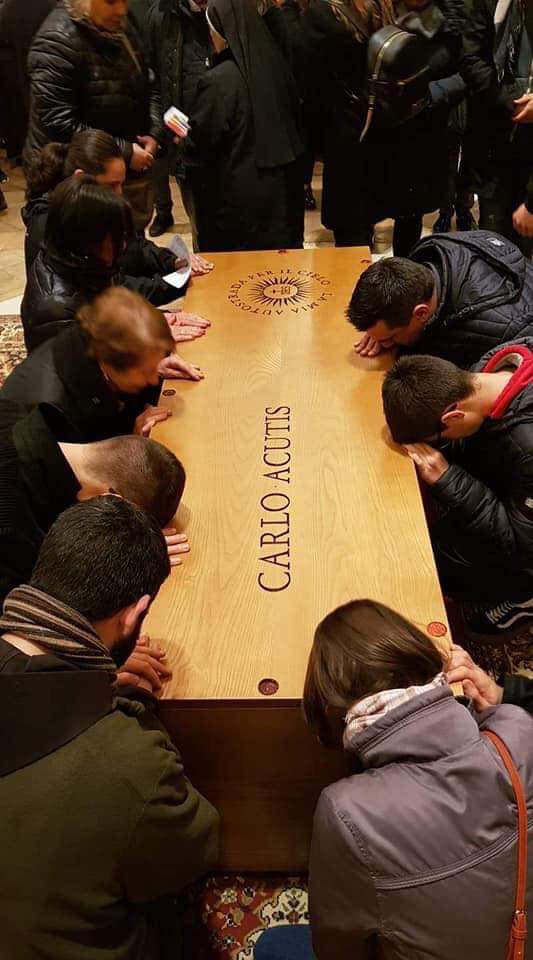 El 23 de enero de 2019 los restos mortales del venerable Carlo Acutis fueron exhumados en virtud de las leyes canónicas. El 5 de abril sus restos se trasladaron a la basílica de San Francisco de Asís, donde se realizó una vigilia de oración. Al día siguiente, el cuerpo de Carlo fue sepultado en un monumento en la nave derecha del santuario, donde cientos de fieles rinden homenaje a Carlo diariamente.